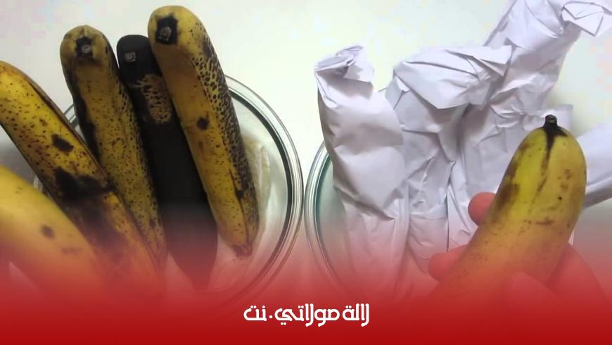 يمكنك سيدتي أن تقومي بوضع حبات الموز داخلَ أوراق، وغلقها جيّداً بواسطة شريط لاصق، ثم وضعها خارجاً داخل طبق زجاجيّ لحين الاستخدام كما يمكنك أن تقوم بوضع كمية من اللصاق على الموز من الرأس وحفظه في مكان بعيد عن الضوء إلى حين الاستعمال .