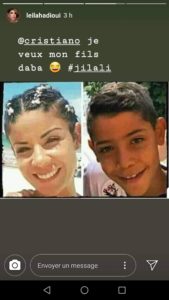 نشرت عارضة الأزياء المغربية ليلى الحديوي صورة لها عبر حسابها الرسمي “إنستغرام”وهي توجه رسالة الى نجم كرة القدم، كريستيانو رونالدو وتمازحه ، وتطالبه فيه بإعادة إبنها “جينيور كريستيانو” إليها نظرا لتشابه إبن كريستيانو بليلى و أرفقت الصورة بتعليق لها قالت فيه