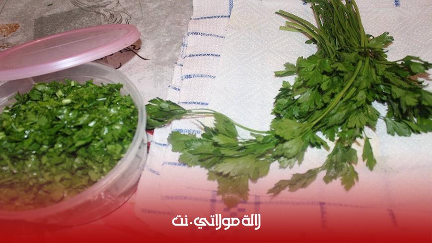 • خوذي كمية كثيرة من القزبور والمعدنوس اغسليهم جيدا وكرضيهم على طريقة العادية
