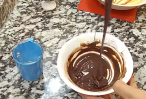 كنطربو بيضة مع سنيدة مع الفاني ونزيدو الحليب ونطربو مزيان، ومن بعد نزيدو الدقيق والخميرة ونبداو نخلطو مزيان وكتجي العجين ثقيلة شوية على عجينة لكيك، كناخدو 2 معالق من العجين ونخلطوهم مع الكاكاو ونزيدو شوية الحليب باش يجي سائل.