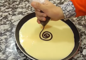 فمقلاة ساخنة مكتلصقش ندهنوها بالزيت ونحطو فيها العجين ونزينوها بالخليط ديال الكاكاو فحال الي فالصورة.