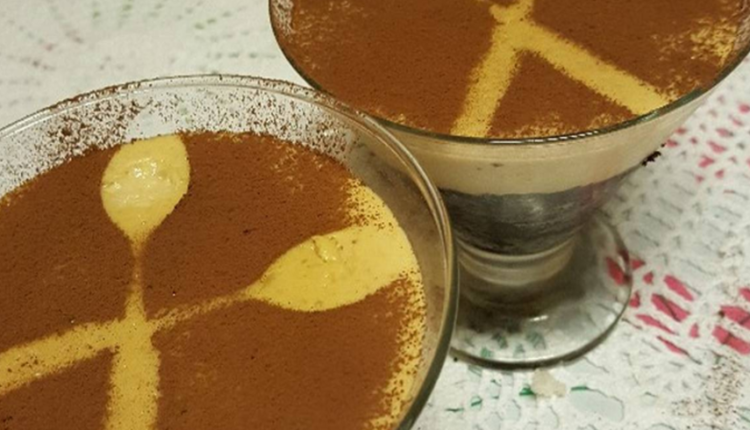 6- وزّعي مزيج البسكويت داخل كاسات التقديم. أضيفي مزيج الياغورت. زيّني الوجه بالكاكاو البودرة.