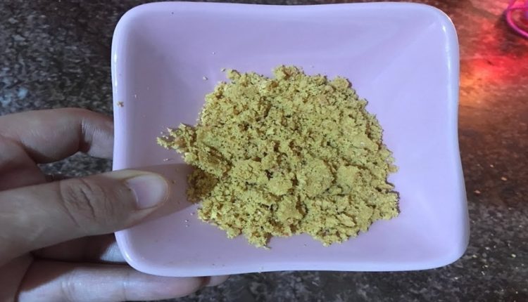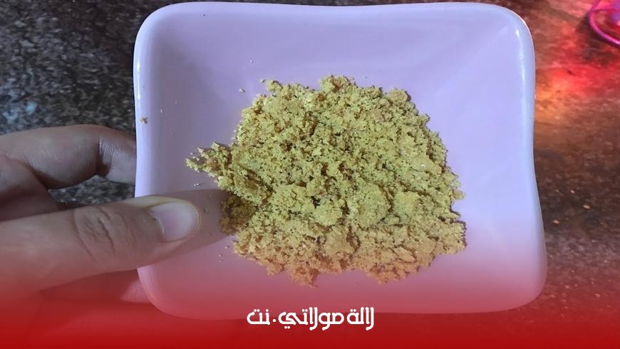 المكونات : ملعقتين من قشر الرمان المجفف والمطحون + ملعقة من ماء الورد + كمية من البومادا الصفراء