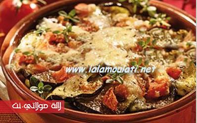 افركي قعر قالب الكرتان بفص الثوم ثم ادهني القالب بزيت الزيتون، صففي الباذنجان، ثم مزيج الطماطم والثوم والزيتون، ثم قطع الجبن.