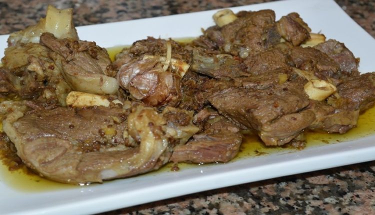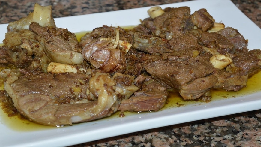 المكونات : لحم الملج + ثوم محكوك +قزبر يابس مطحون +ملح +ابزار +كمون +خرقوم +سكنجبير زعفران شعرة +سمن +زيت زيتون +حامض مرقد