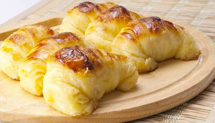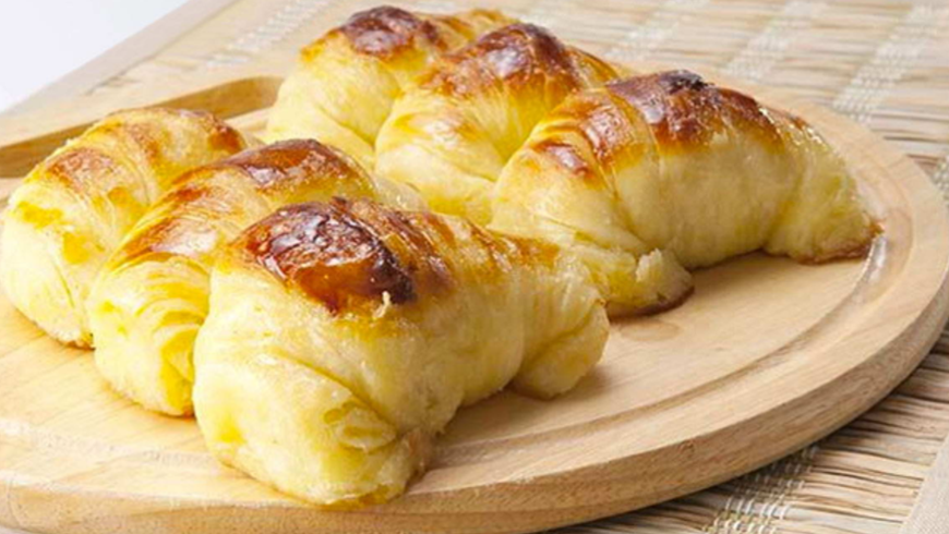 نرتب المثلثات بحيث يكون الضلع الأكبر في طرفنا ونحدث شق صغير في أولها ثم نضع عليها اصبع من الجبن ونلفها بشكل محكم حتى تأخذ شكل الكرواسان. نرتب الكرواسان في صينية فرن مبطنة بورق فرن، نغطيها بمنديل مطبخ مرطب قليلاً وندعها تتخمر حتى يتضاعف حجمها.