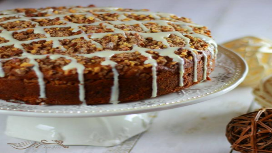 6. بملعقة يوضع نصف الخليط في القالب ويوزع بسكين. يرش نصف كمية الستريوسل ويوضع بقية الخليط في القالب، يرش ما تبقى من الستريوسل على الوجه. تخبز لمدة 40-50 دقيقة، حتى يخرج عود أسنان منها نظيفا.