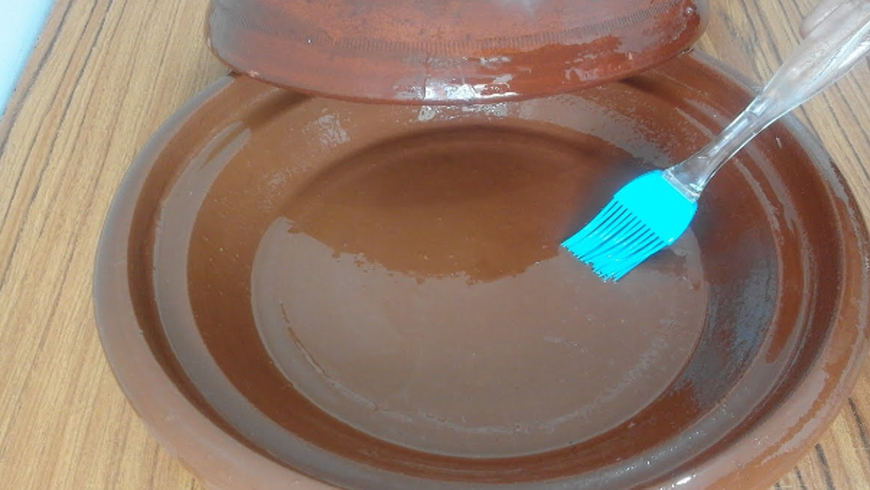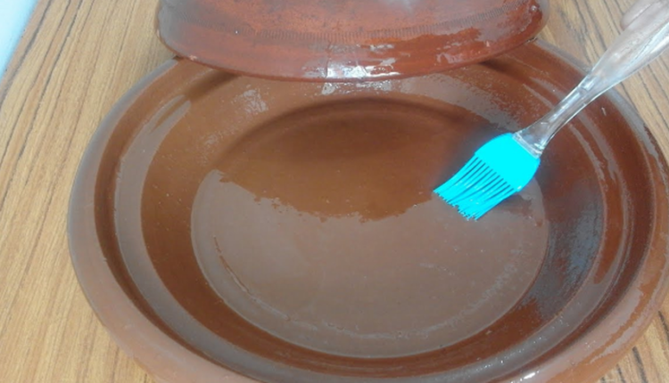 • بعدها نفرغ الزيت و نمرره على الطاجين بأكمله نتركه حتى يجف ثم نكرر الزيت 3 مرات هكذا يكون الطاجين جاهز للاستعمال.