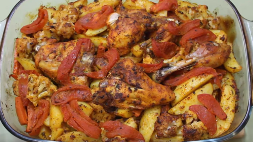 - وزعي الخضار على أطراف الصينية وعلى جوانب الدجاج.