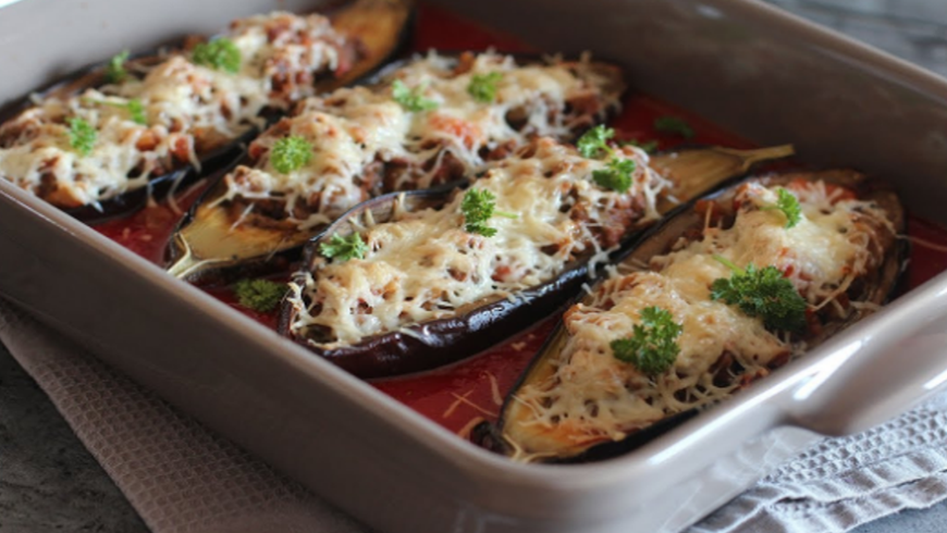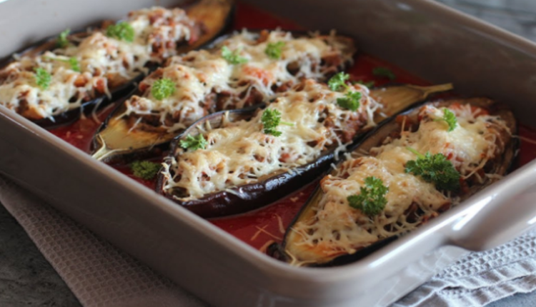 • توضع في قالب يدخل الفرن و يتبل الباذنجان بالملح و يحشى بالصلصة و كرات البطاطس و يرش بالجبن