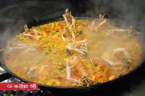ويصب عليه كل ما في الطنجرة بشكل متساو حيث يكون في كل جانب اللحم والدجاج والقريدس والكلماري والمرقة كلها.