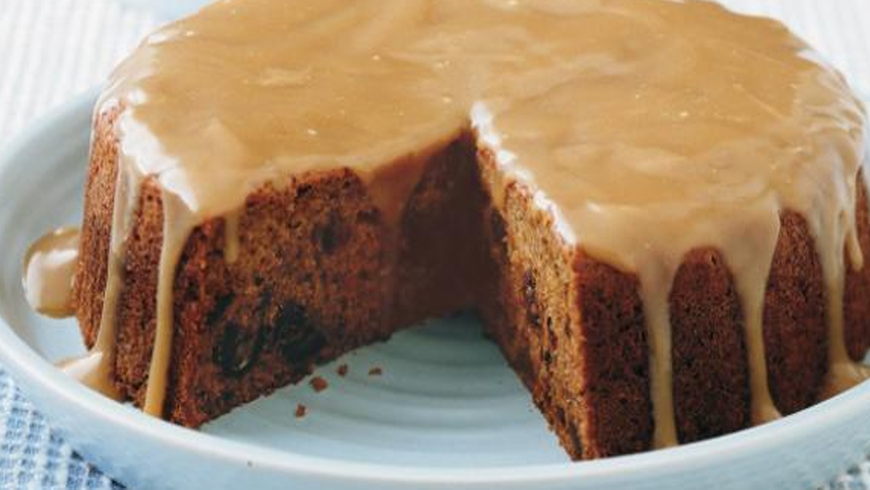 8- أخرجي الصينية من الفرن. إدهني مزيج التمر على وجه الكيك دون أن تقتربي من الأطراف.