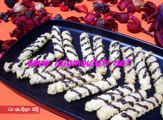 نأخد اناء ونخلط فيه الزبدة والسكر حتى نحصل على خليط مثل الكريمة نضيف النشا وبودرة اللوز والفاني ونضيف الدقيق شوي شوي حتى نحصل على عجينة لينة نعمل العجينة في جيب حلواني ونعمل بيهم مستطيلات على صفيحة مدهونة وندخلهم للفرن 15 دقيقة ندوب الشوكولا على حمام مريا ونزوق بيها المستطيلات على شكل خطوط