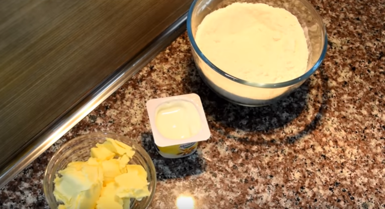 • نأخذ الزبدة في اناء ونضيف عليها الياغورت ثم الدقيق تدريجيا