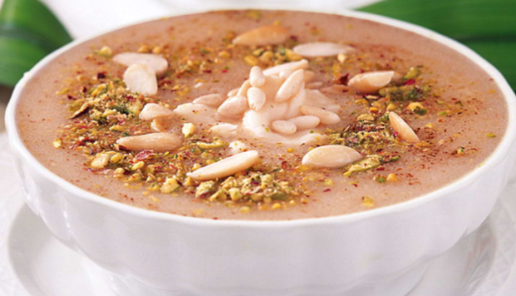 ثم ترفع من على النار وتصب في طبق ويرش عليها القرفة والفستق المطحون ثم تقطع وتقدم مع القشطة.