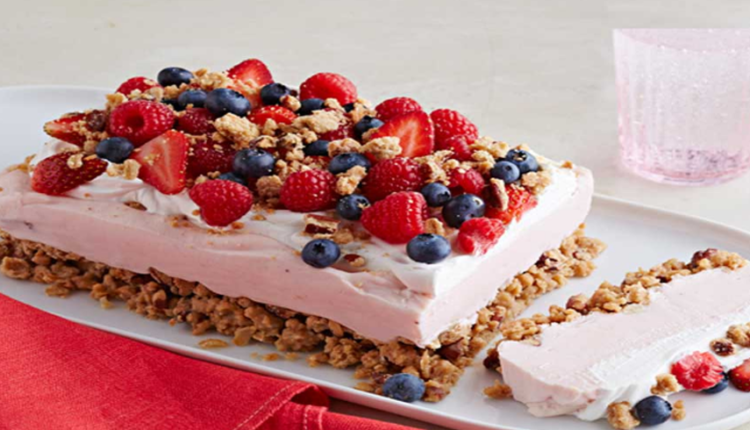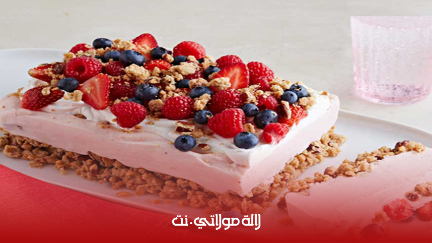- اخلطي الياغورت مع الحليب البودرة والسكر في الخلّاط ثُم افردي الخليط على البسكوت في الصينية وادخليها الفرن حتى تتماسك المكونات ولكن احرصي ألا يتغير لون طبقة الزبادي