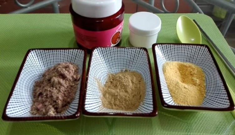 المكونات : ملعقتين من الحمص المطحون + ملعقتين من الفول المطحون + ملعقتين من الخزامى المطحونة + ملعقتين من الحناء الطبيعية + ملعقة من الحلبة المطحونة + ملعقتين من الصابون البلدي بالعكر الفاسي + ملعقتين من زيت جوز الهند .