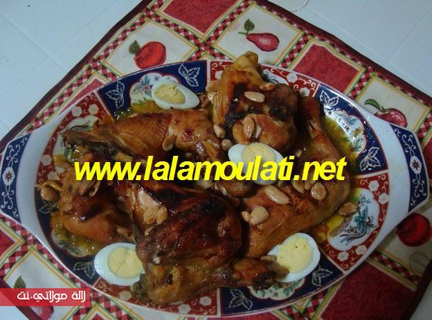 عندما ينضج الدجاج ناخد قطع الدجاج ونضعه في لاطة الفرن وندهن قطع الدجاج بالزبدة والعسل جيدا وندخله الى الفرن حتى يتحمر ونزينه بالوز و الزنجلان اما اضفت البيض المسلوق كنتمنى انكم تجربوها رائعة جداااااااااا وشكرا