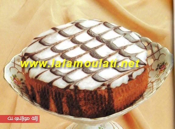 ثم يطبخ لمدة 25 دقيقة تقريبا .بعدما يبرد يدهن بالشكلاط الدائب الابيض