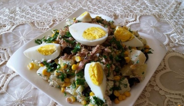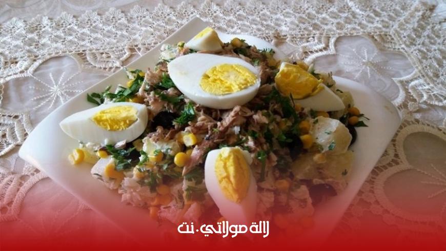 المكونات : كمية من البطاطس مقطعة مربعات +ذرة معلبة (ماييس) +علبة تونة + 2 ملاعق كبيرة قزبرة و معدنوس مفرومين + زيتون أسود مقطع دوائر + 2ملاعق كبيرة مايونيز +خل الليمون +فلفل أسود +ملح +زيت الزيتون للتزيين: بيض مسلوق.