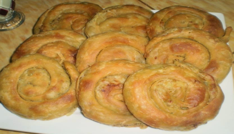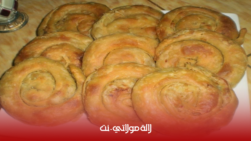 ثم نلفها بشكل حلزوني على شكل محنشة و نستمر بنفس الطريقة مع باقي الحشوة و العجين