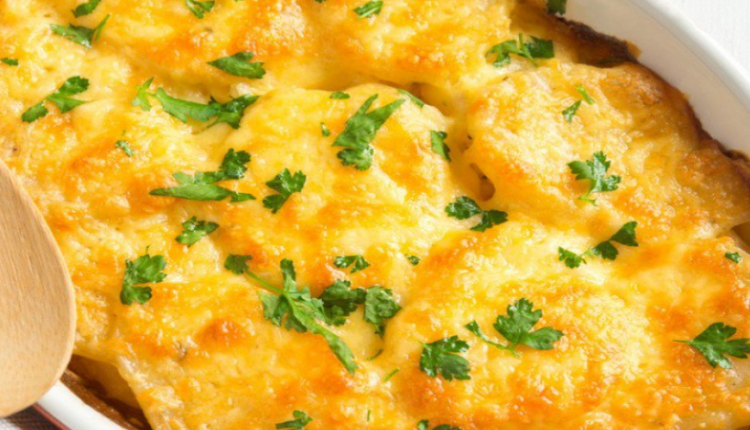 5. أدخلي الصينية إلى فرن محمى مسبقاً على حرارة 180 درجة مئوية لحوالي 15 دقيقة حتى تنضج صينية البطاطس وتتحمر.
