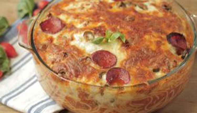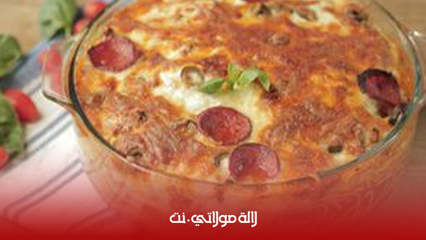 - وزّعي خليط اللحم والسباغيتي في صينية بيركس مستطيلة الشكل.