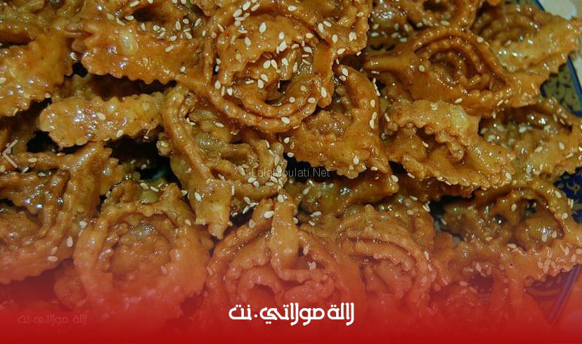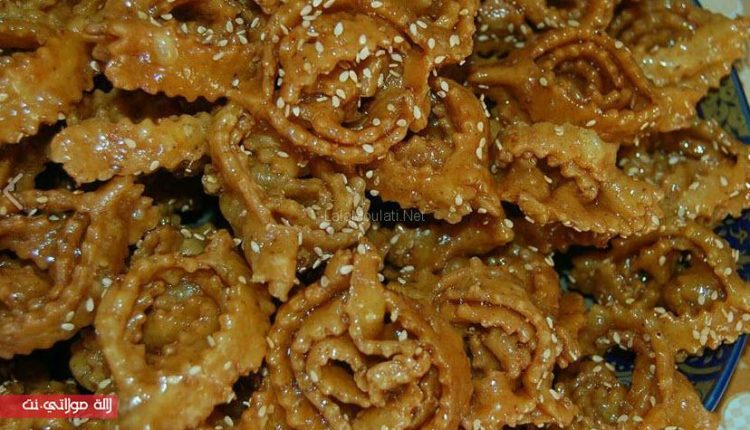 يخلط النواشف جيدا حتى ينسجم الكل ويضاف اصفر البيض والسوائل لمتجمعاتش يضاف قليل ماء الزهر تكون قاصحة نوعا ما تدلك قليلا وتعمل حرابل وترتاح في بلاستيكة 10د وتطلق مثل العادة تشبك وتقلى في الزيت وتطفى في العسل وترش بالجنجلان محمر