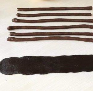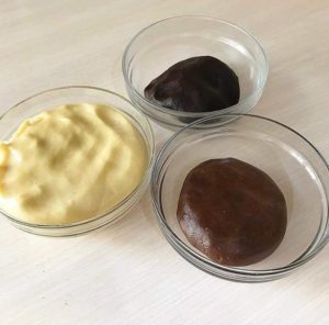الجزء الكبير لا نضيف له الكاكاو. الوسط نضيف له ثلاث ارباع كمية الكاكاو و الجزء الصغير نضيف له ربع كمية الكاكاو كما موضح بالصورة نعجنها ونتركها في الثلاجة نصف ساعة ثم نبدأ التشكيل كما بالصور