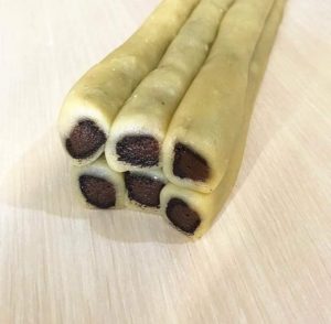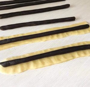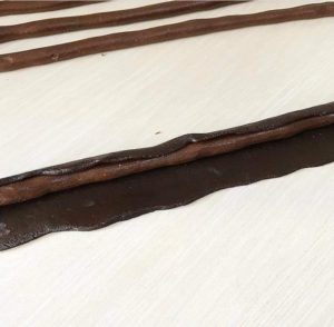 لتشكل لنا 6 رولات بشكل نقشة التايجر نجمعهم لبعض كما بالصور ونبدأ بوضعها بصينة مبطنة ورق زبدة وتدخل فرن ساخن من قبل 160 درجة حتي يتغير لونها تخرج ليبرد ثم تزين بأي نوع شكولاتة ذائبة تم تقطع و بالصحة و الراحة