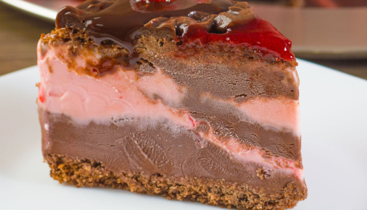 - بملعقة الآيس كريم ضعي طبقة من آيس كريم الفراولة اللين ثم طبقة كيك ثم طبقة آيس كريم الشوكولاتة بالتبادل. ونصف كمية صوص الفراولة.