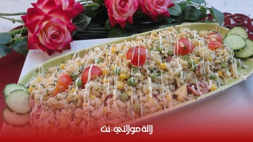 - المكونات : علبة ياغورت طبيعي + رأس ثوم + 3 حبات من الخيار + كمية من الخضار المشكلة المقطعة والمسلوقة + نصف ملعقة من الملح + نصف ملعقة من النعناع الجاف + ملعقتين من الذرة + كمية من الأرز المسلوق
