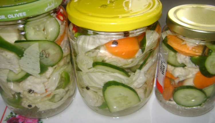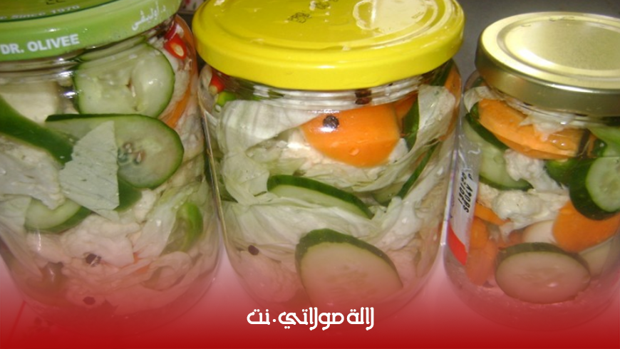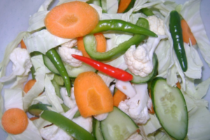 • نغسل الخضار جيدا و نقطعها بالطول أو دوائر ماعدا الفلفل الحار ونحاول أن تكون قطع الخضار رقيقة ونخلطها مع بعض .