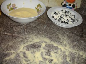 - نرش مكان نظيف بالسميدة ونسرح فوقه جزء من العجينة ونرش الزيتون والفرماج