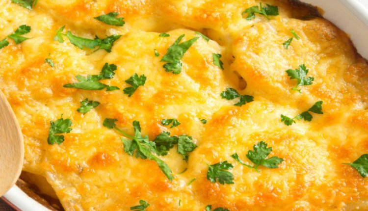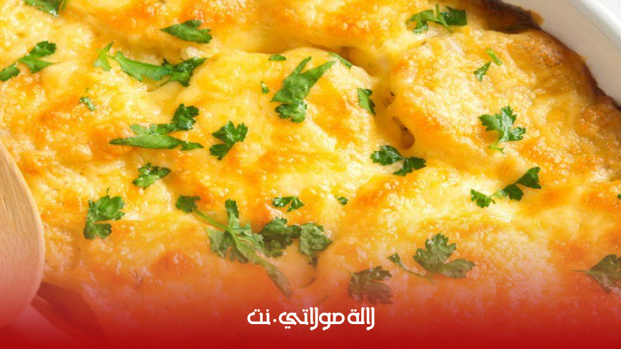 - وزعي خليط البطاطس في صينية فرن ثم وزعي جبن الموزاريلا وجبن البارميزان على الوجه.