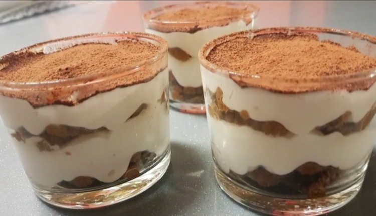 7. رشّي ما تبقّى من الكاكاو على الوجه ثم أدخلي الكاسات إلى الثلاجة لمدة 8 ساعات حتى يجمد التيراميسو.