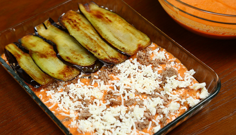 في صحن الفرن، تصفف شرائح البادنجان، تسقى بالصلصة واللحم المفروم والجبن المبشور.