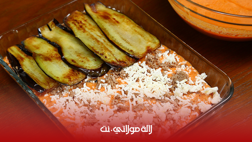 تعاد نفس العملية ثم تضاف طبقة من شرائح البادنجان.