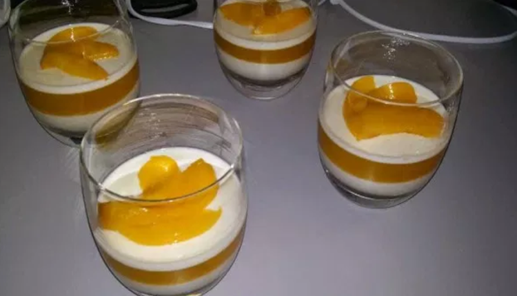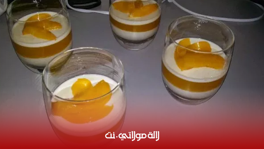 في كؤوس التقديم نضع طبقة من البانا كوتا و نضعه في الثلاجة 15 دقيقة حتى يتماسك ثم طبقة الخوخ و نضعه في الثلاجة مرة اخرى مدة 15 دقيقة حتى يتماسك و وهكذا حتى ننتهي من كل الكمية ثم نزينها بالفاكهة او بالشكلاط او حسب الرغبة