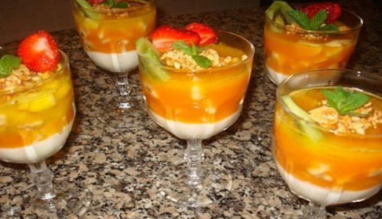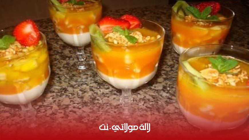 بالنسبة لهدا الديسير كيجي رائع وفي المنضر كيجي راقي والطريقة فهي كالاتي قطعي الفواكه اللي متوفرة عندك وعصري عليها شوي الحامض باش ما تكحالش وتاكسد ثم ديري 2/1 الحليب مع 3 معالق الكريم باتيسيير او الا ما عندكش ممكن تعوضيه بمايزينا+السكر حسب الذوق وطيبيه على النار حتى يعقاد ثم صبيه في كيسان التقديم وخليه حتى يشد راسو عاد زيدي الفواكه اللي قطعتي ,وعاود جيبي 2/1 عصير الليمون وخلطيه مع ساشي ديال الفلون +السكر وطيبيه على النار حتى يعقاد وصبيه في الكيسان على الفواكه من فوق وديريهم في الثلاجة اما التزيين فلك كامل الاختيار والابداع بالصحة والراحة