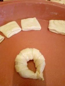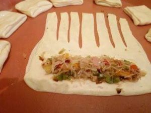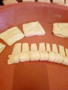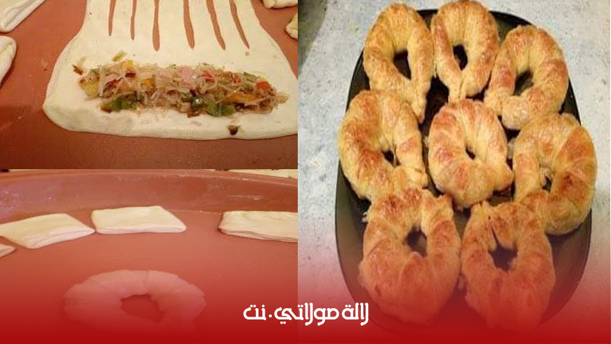تبسط كل كورة بخليط الزبدة و تطوى على اربعة يبسط المربع كما توضح الصورة و تقطع الجوانب و توضع الحشوة في النصف الاخر و نلف ثم تلف على شكل دائرة و تدهن باصفر البيض و قطرة خل و الى الفرن