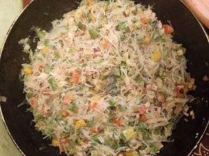 و نحضر الحشوة بحيث نشحر البصل و الفلافل في القليل من الزيت ثم نضيف باقي العناصر و الطون و الفرماج بعد ان نزيل المقلاة من على النار