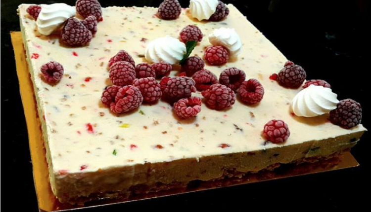 750 غ من القشدة الطرية مطلعينها ، 7 أبيض البيض ، 150 غ سنيدة ، 50 غ ماء ، 100 غ عسل من النوع الجيد ، 70 غ من الزبيب صغير ، علبة من الفواكه معسلة ، 150 غ من اللوز محمر بالقشرة و 50 غ بيسطاش محمر.