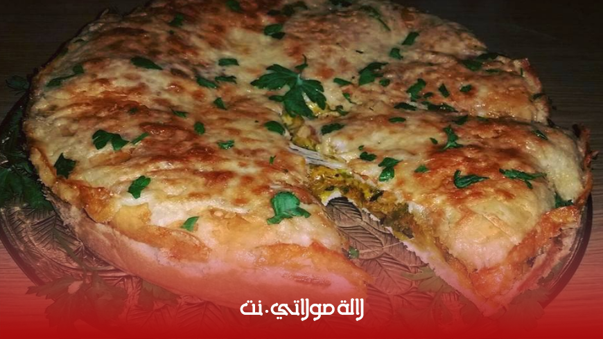 نأخذ العجين نقسمه الى نصفين و ندلك الطرف الأول إلى أن يصبح عجينة رقيقة نضعها في المول تم نضع الحشوة و نسرح الطرف التاني من العجينة بنفس الطريقة و ونضعه فوق الحشوة ونغلق العجينة من الجوانب. نقوم بعمل تقب بالشوكة و ندهنها باصفر بيضة و ندخلها للفرن حتى تنضج و نضع القليل من الجبن من فوق ندخلها للفرن مدة 10 دقائق مجددا و بالصحة والراحة.