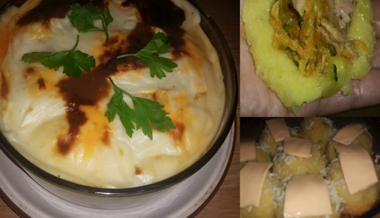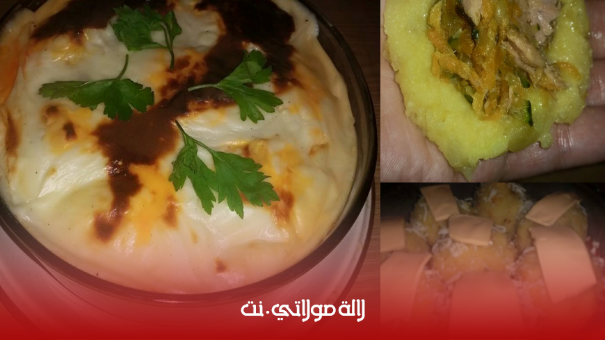 ناخد الطبق اللذي سيدخل إلى الفرن نضع فيه صلصة الطماطم و ناخد القليل من البطاطس نضعها في راحة اليد نملاها بالحشوة تم نغلقها على شكل كرة. تم نضعها فوق الصلصة ونرش الجبن تم صلصة البيشاميل وندخلها للفرن