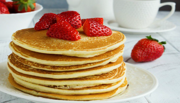 8. في كل طبق، ضعي قطعتين أو ثلاث قطع بان كيك فوق بعضها.