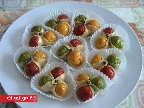 500غ عقدة لوز بدون إضافة بيضة وقرفة كل عجينة ملونة تكون بنكهة (ليمون -فانيلا – فسدق) (ملوينات غدائية :احمر-اصفر – اخضر) تقسم عقدة لوز 3 اجزاء كل واحد بلون تعمل منه كويرات صغيرة .