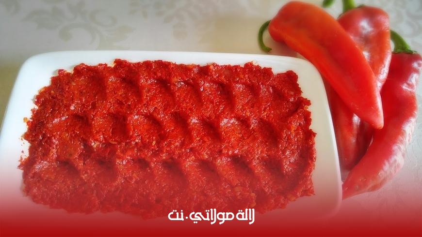 - قومي سيدتي باحضار حبة فلفل احمر ناضجة والقليل من الملح وهي المكونات التي ستحتاجينها، ثم قومي بوضع حبة الفلفل بعد ازالة البذور منها في إناء لتفور على النار مدة 30 دقيقة ثم قومي بازالتها وطنحها مع إضافة الملح والاحتفاظ بها في إناء في الثلاجة إلى حين الاستعمال مع إضافة مختلف النكهات التي ترغبين فيها كنكهة الليمون أو الفلفل الحار أو غيرها.