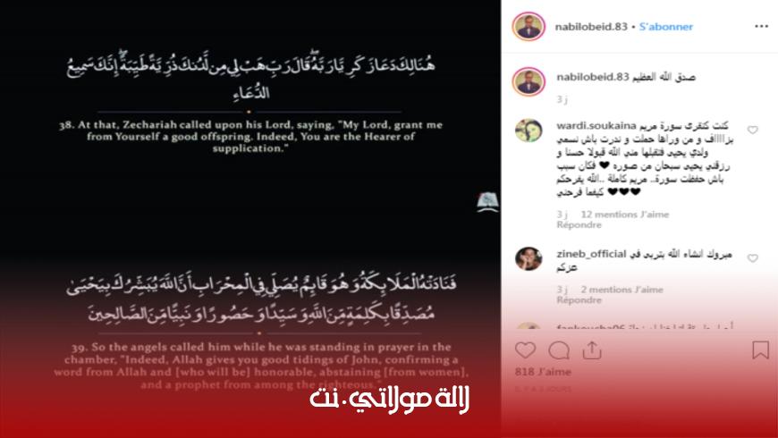 ونشر “عبيد” عبر حسابه الخاص بأحد مواقع التواصل الإجتماعي، صورة لآية قرآنية اعتبرها متابعو الفنانة أنه تلميح واضح لحملها، وجاء في الآية الكريمة: “هُنَالِكَ دَعَا زَكَرِيَّا رَبَّهُ ۖ قَالَ رَبِّ هَبْ لِي مِن لَّدُنكَ ذُرِّيَّةً طَيِّبَةً ۖ إِنَّكَ سَمِيعُ الدُّعَاءِ (38) فَنَادَتْهُ الْمَلَائِكَةُ وَهُوَ قَائِمٌ يُصَلِّي فِي الْمِحْرَابِ أَنَّ اللَّهَ يُبَشِّرُكَ بِيَحْيَىٰ مُصَدِّقًا بِكَلِمَةٍ مِّنَ اللَّهِ وَسَيِّدًا وَحَصُورًا وَنَبِيًّا مِّنَ الصَّالِحِينَ (39)”.