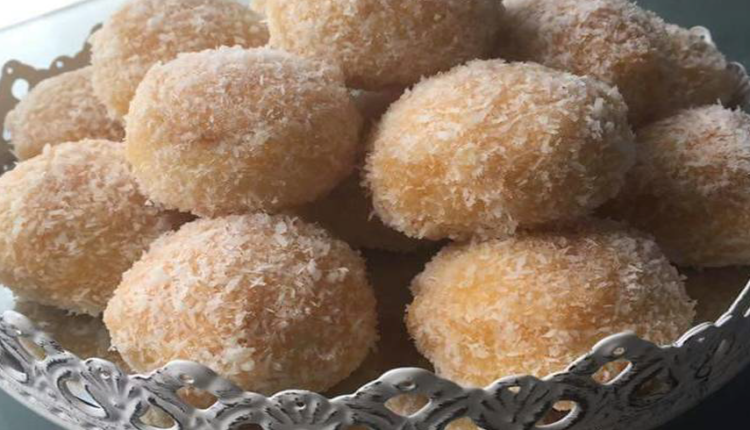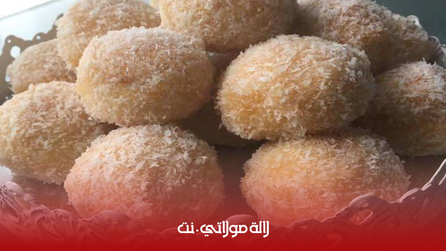 و لما تاخذ اللون الذهبي نخرجها من الفرن و نخابها تبرد و نلصق بين كرة و كرة بالمربى يعني نص نص كرة لما نلصقها تصبح كرة متناسقة و نغطسها داخل المربى و نشيلها و نحطها داخل جوز الهند.